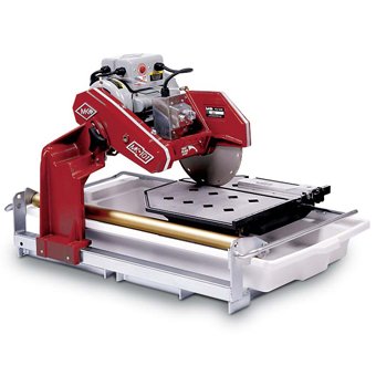 Free shipping from MK factory warehouse to lower 48 states. Free 10" Hot Dog diamond blade, side extension table, water pump, stand w/ wheels, rip guide, large miter guide, dressing stone, adjustable protractor, and dual angle guide. High torque belt driven 115V/60Hz 2HP motor. 20" rip cut capacity. Diagonal cuts 14" x 14" tile. Weighs 103 lbs. Depth of cut(10" Diamond Blade): 3-3/4". Dimensions: 36" x 21.5" x 22.5".